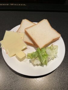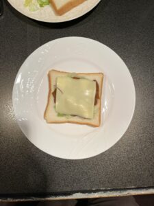 ①食パン1枚にレタス、カレー、チーズの順にのせて、もう1枚の食パンで挟む
