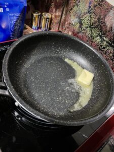 ②熱したフライパンにバターを入れ、中火で焼き色がつくまで焼く